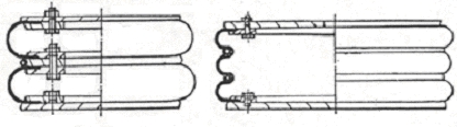 橡膠空氣彈簧按橡膠囊的曲數分為單(一)曲,雙(二)曲,三曲,……,n曲,如圖1-3和圖1-4所示。隨著曲數的增加,剛度變小,橡膠空氣彈簧隔振系統的固有頻率也相應減小。但這不僅給制造上帶來了麻煩,而且還會引起橡膠囊的彈性不穩,因此一般只使用到4曲。