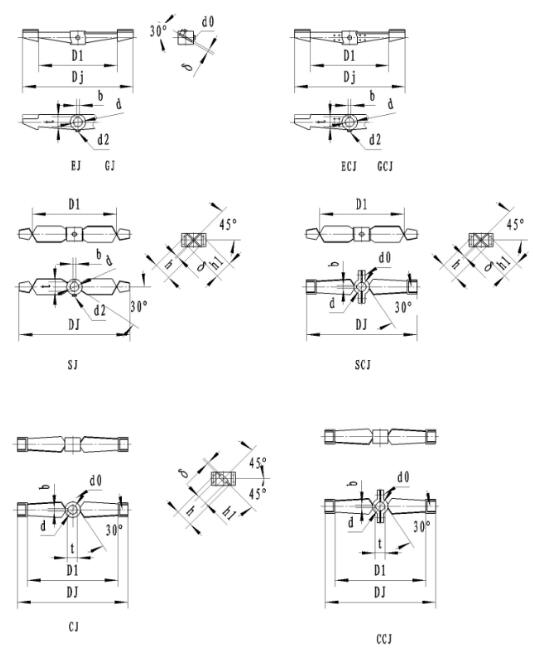 | DJ | d | D1 | h | h1 | 螺栓d0 | b | t | N/n 不大于 |