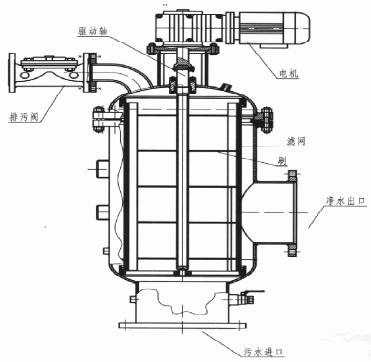 刷式自清洗過濾器為一種適用于惡劣環境的自清洗過濾器,對于不同的使用要求可配備3500微米-200微米的濾網。過濾器的清洗過程由一個時刻監測過濾網兩側壓差的壓差開關來啟動,通常情況下壓差開關的預設值是0.05Mpa。當過濾器濾網兩側壓差達到預設值時,過濾器將開始自清洗過程,整個自清洗過程包含兩個步驟:打開位于過濾器端蓋上的排污閥;電機帶動濾網內的不銹鋼刷轉動,被濾網所捕捉的雜質被鋼刷刷下并從排污閥排出。整個清洗過程耗時 約20秒,清洗時系統不斷流,過濾器 的整個運行過程由隨機配備的一個控制箱來控制。圖2為北京化工大學與唐山陸凱科技有限公司共同研制的刷式自清洗過濾器結構示意圖。